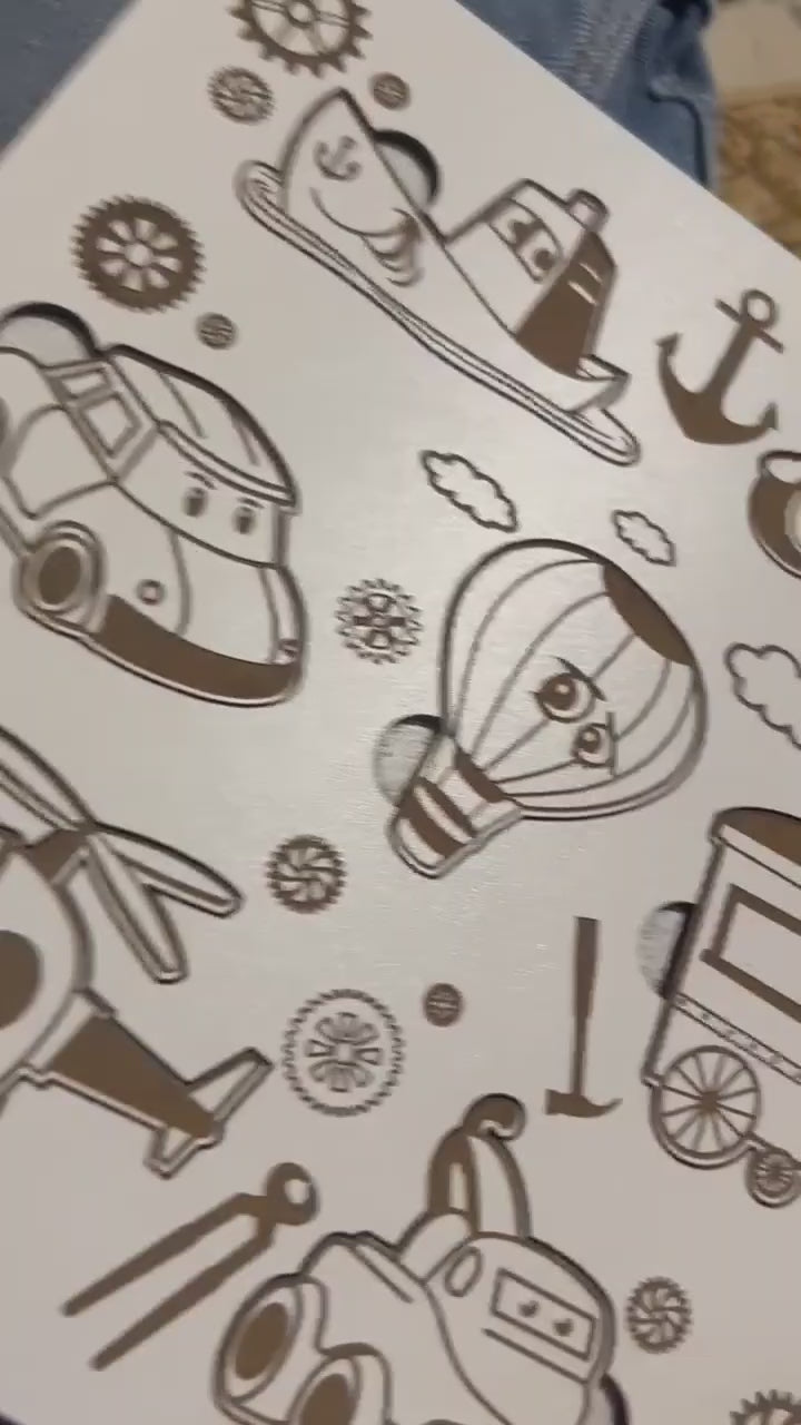 Peça em madeira natural gravada a laser, com ilustrações detalhadas de diferentes meios de transporte: carro, mota, helicóptero, balão de ar quente, barco, comboio e muito mais.